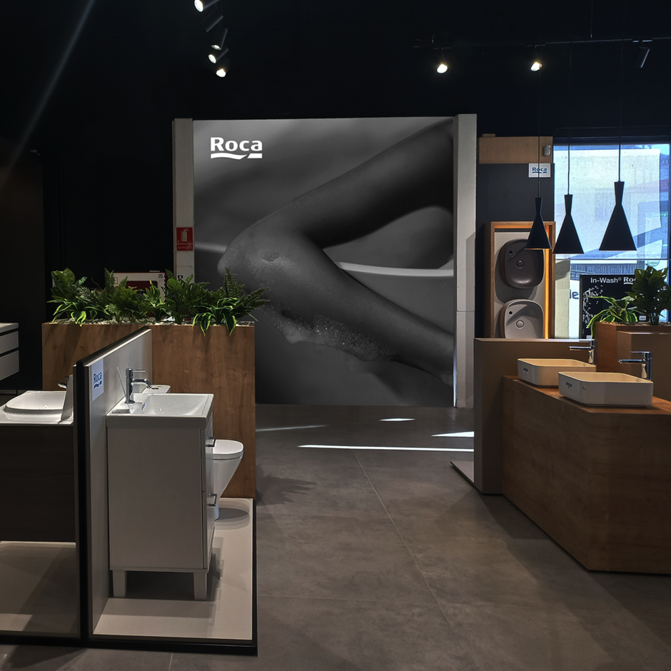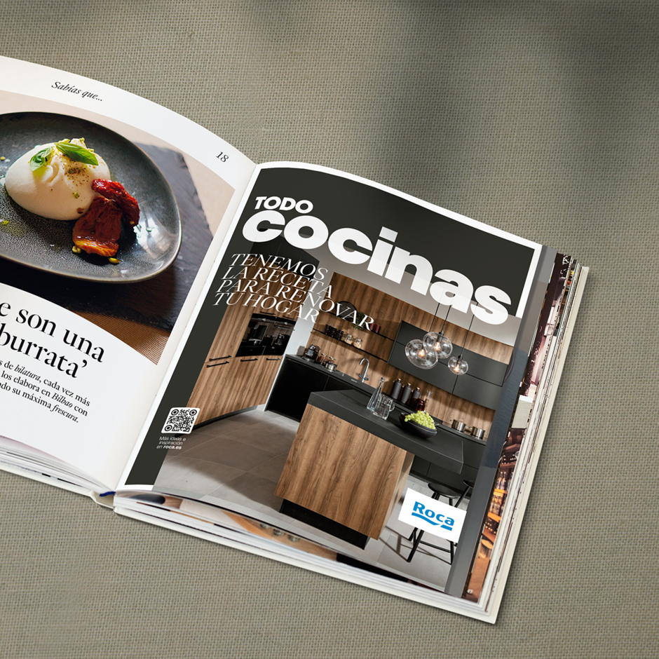BINOMI collaborates with Roca Sanitario and Cocinas, adapting the corporate image and style guide to various graphic supports such as: magazine advertisements, catalogs, stands for fairs, branding updates, billboards, vinyls for distributors and showrooms...